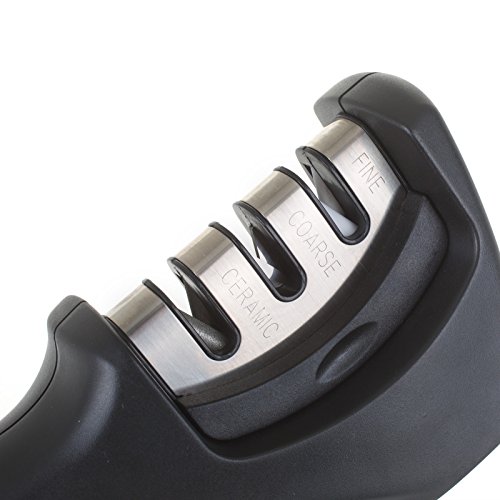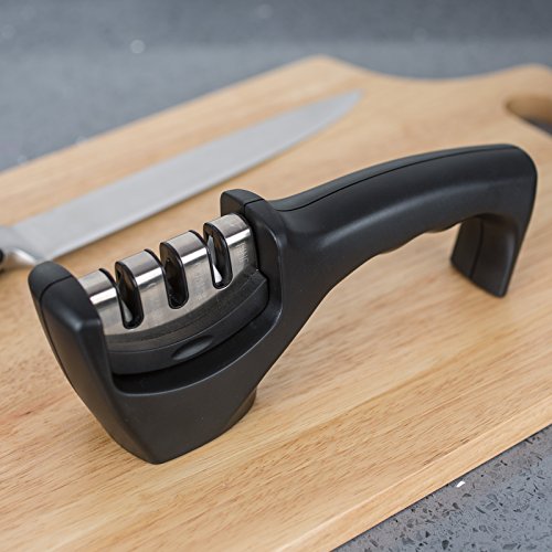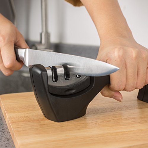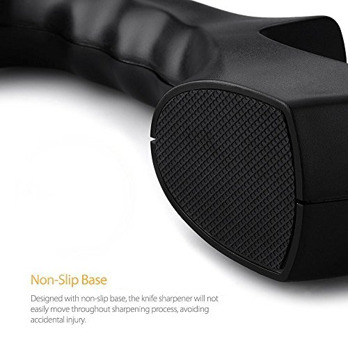 This is what you need: The knife sharpener effectively sharpens straight-edge knives in just seconds. Its non-slip base and ergonomic handle makes sharpening easier and safer than other. This is the only knife-sharpening tool that you need.User Tips: -Pull inwards from the outside when you sharpen your knife, never go back and forth. -Don't put sharpener in or on water. Keep the sharpener dry and clean. -Don't use an excessive amount of power to sharpen the knives. -Brush away any tiny metal shards on/in the knife sharpener after sharpening your knives. -Please keep the sharpener and knife out of reach for children to avoid accident. -Not suitable for serrated knives or scissors. Characteristic:Feature