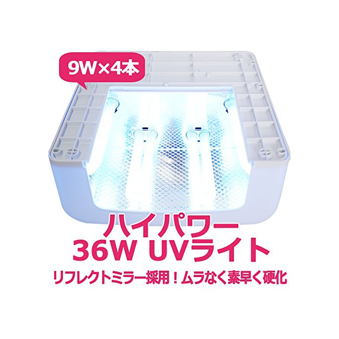 젤 네일과 UV레진 어느 쪽도 민첩하게 경화하는 프로 납품업자(어용상인)의 UV라이트36W.착탈가능한4개 9W의 UV관 부착,조사가 중앙에 집중하는 형태로 설계되는 위,re《후레쿠토미라》(전면 반사)채용이기 때문에,구석구석까지광이 반사하고, 균일하게 재빠르게 경화로 옵니다.개구부가 크기 때문에 한쪽 손 한쪽 발이 푹(쏙) 들어 가 ## 것이다!페디큐어,풋 네일 대응 넓음 공간에서 스트레스 프리!!