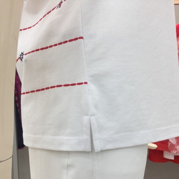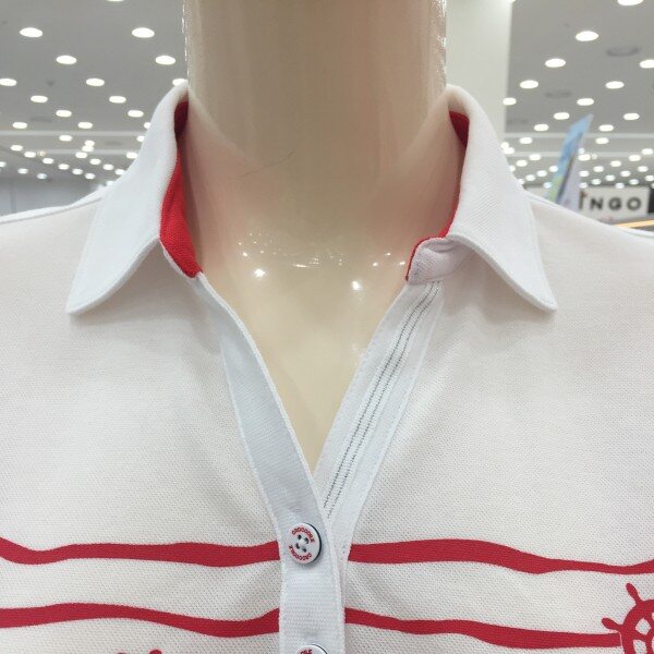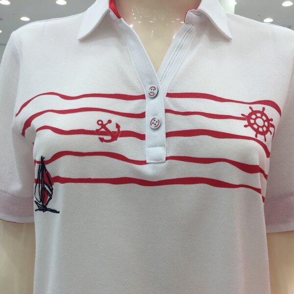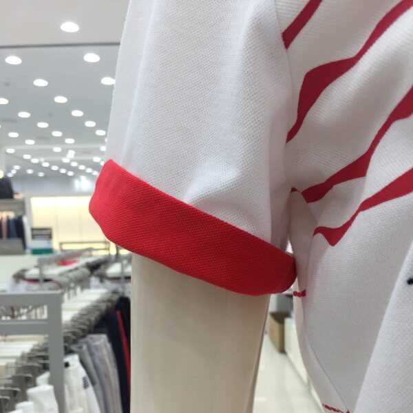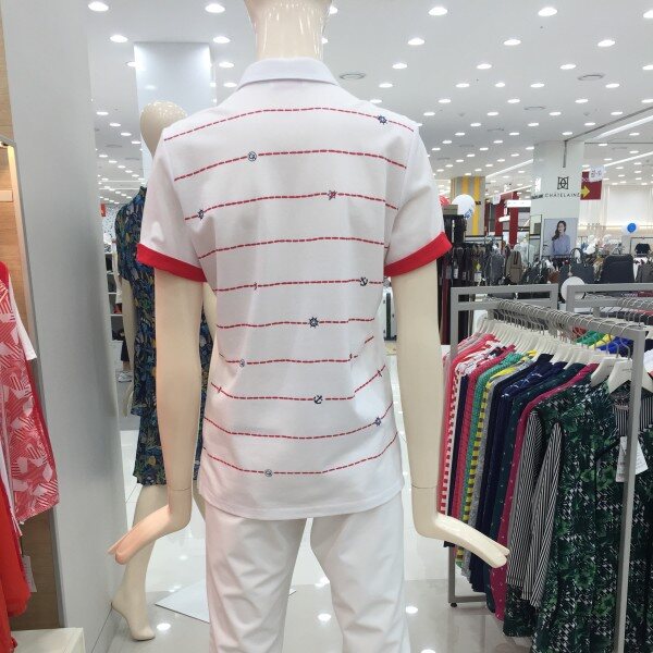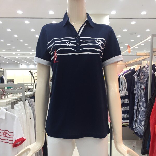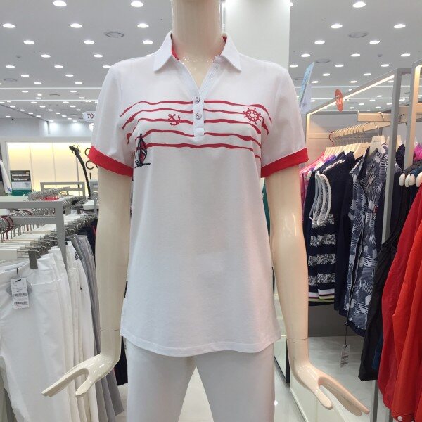 멀실켓 피케 소재의 와이넥 카라 티셔츠로 마린풍의 스트라이프 프린트가 시원한 느낌을 주는 아이템.