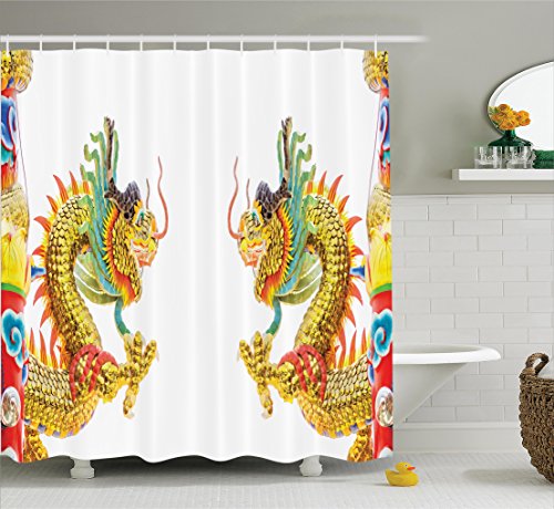 Dragon Decor Shower Curtain Set By Ambesonne, Chinese Style Dragon Statue Spiritual Power Asian Holy Symbols Oriental Culture Theme, Bathroom Accessories, 69W X 70L Inches, Golden Red