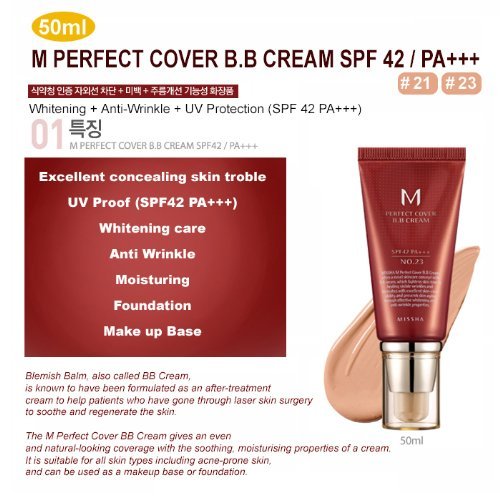 - Feature : 50 ml / MISSHA M Perfect Cover B.B Cream (No.23 Natural Beige) SPF42 PA+++ / Multi function BB Cream with effect of UV blocking. / Whitening and Wrinkle care