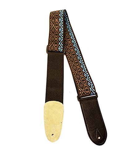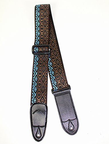 -. Feature : Hand Sewn Guitar or Bass Strap 2" Wide, adjustable from 32"-55" / Jacquard woven Woodstock design / High quality webbing backing material / Thick leather end caps / Non-scratching poly adjusters