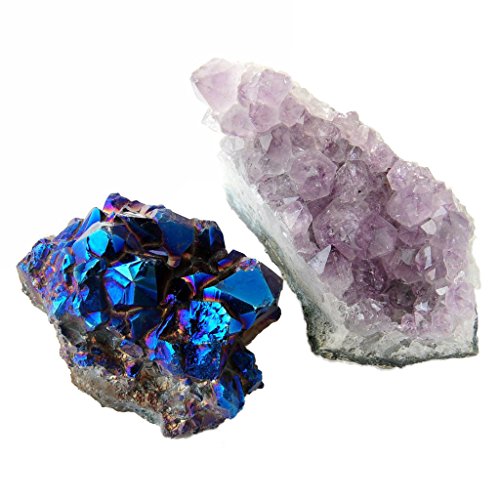 2 Piece Assortment Set of 1 Natural Amethyst Druze (1.5 to 3 Inches) and 1 Blue Titanium Coated Amethyst Druze (1.5 to 3 Inches)