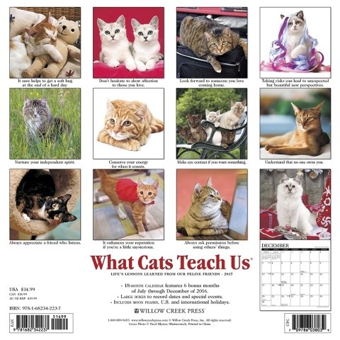 -. Binding : Office Product -. Brand : Willow Creek Press -. EAN : 0705911297586 -. Feature : 2017 Calendar featuring beautiful images for every month of the year. / Includes Holidays and Observances. / Keep your appointments and Birthdays organized in one place! / Perfect for office spaces, bedrooms, classrooms and more! / Makes a great gift for friends and family! -. Label : Willow Creek Press -. Manufacturer : Willow Creek Press -. MPN : 42237 -. PackageQuantity : 1 -. PartNumber : 42237 -. ProductGroup : Office Product -. ProductTypeName : OFFICE_PRODUCTS -. Publisher : Willow Creek Press -. Studio : Willow Creek Press -. Title : 2017 What Cats Teach Us Calendar - 12 x 12 Wall Calendar -. UPC : 705911297586