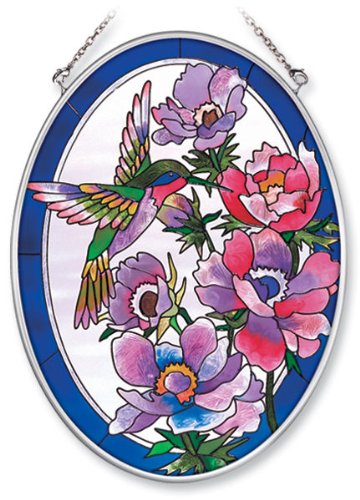 Amia Hand Painted Glass Suncatcher with Floral Hummingbird Design, 5-1/4-Inch by 7-Inch Oval