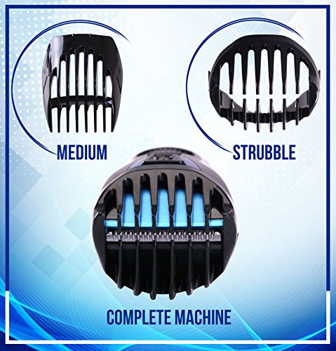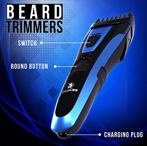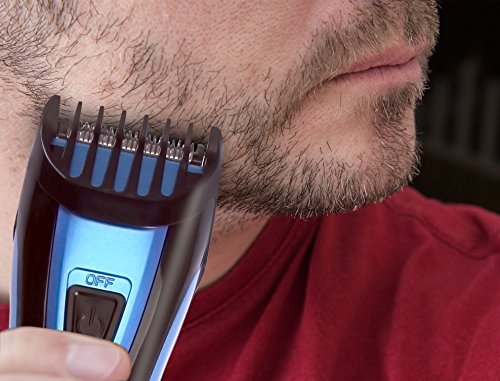 Premium quality beard trimmer to take care of your grooming needs; black injection body with blue decoration gives it a stylish look