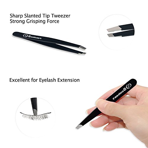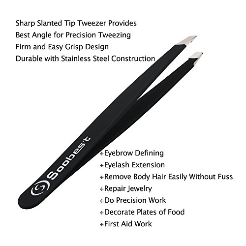 - Versatile Black Eyebrow Precision Tweezers: Versatile enough, this slant tip tweezer is perfect for eyebrow defining, false eyelash extension, mustache control, repair jewelry and do some first aid work etc. Prudent black slant eyebrow plucker, recommended for both makeup artists and beginners.