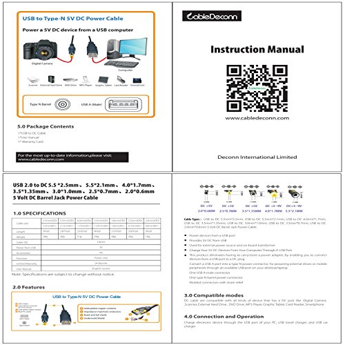 CableDeconn USB to 5.5 mm/2.1 mm 5 Volt DC Barrel Jack Power Cable