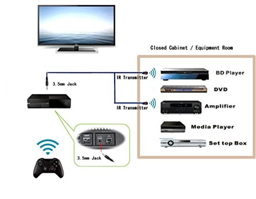 Studio : SHENZHEN CHENGHAOTONG ELECTRONIC CO.,LTD. Publisher : SHENZHEN CHENGHAOTONG ELECTRONIC CO.,LTD. Binding : Electronics Product Description An IR emitter extension cable have a self-adhesive pad that allow it to be stuck directly to the IR sensor window of your AV device, or can be used as a flood for multiple devices when properly mounted. Direct connection the device will always provide you the best performance.You can position an emitter in otherwise difficult-to-access spaces and work around things like media cabinets, decorations, and so on. You can install this IR extension cable with Xbox One in a few simple steps: 1. Connect your IR extension cable to the IR port on the back of the Xbox One 2. Position the emitters near the devices you want to control. These may be designed to fit under the device near the IR window, or they may be sticky and adhere directly to the IR window 3. Test to make sure you can control the device. Reposition the emitters if necessary Package Content: 1x 2- Eye Infrared 3.5mm Jack Remote Control Extender Emitter Cable Wire 0