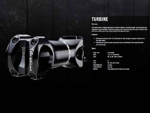 Studio : Cyclone Bicycle Publisher : Cyclone Bicycle Binding : Sports Product Description The Turbine stem is highly engineered to maximize stiffness minimize weight and guarantee you're cockpit won't get overlooked. Featuring aerospace 7075 aluminum alloy, this stem is ideal for high level cross country racers but is strong enough for all mountain epics. 0