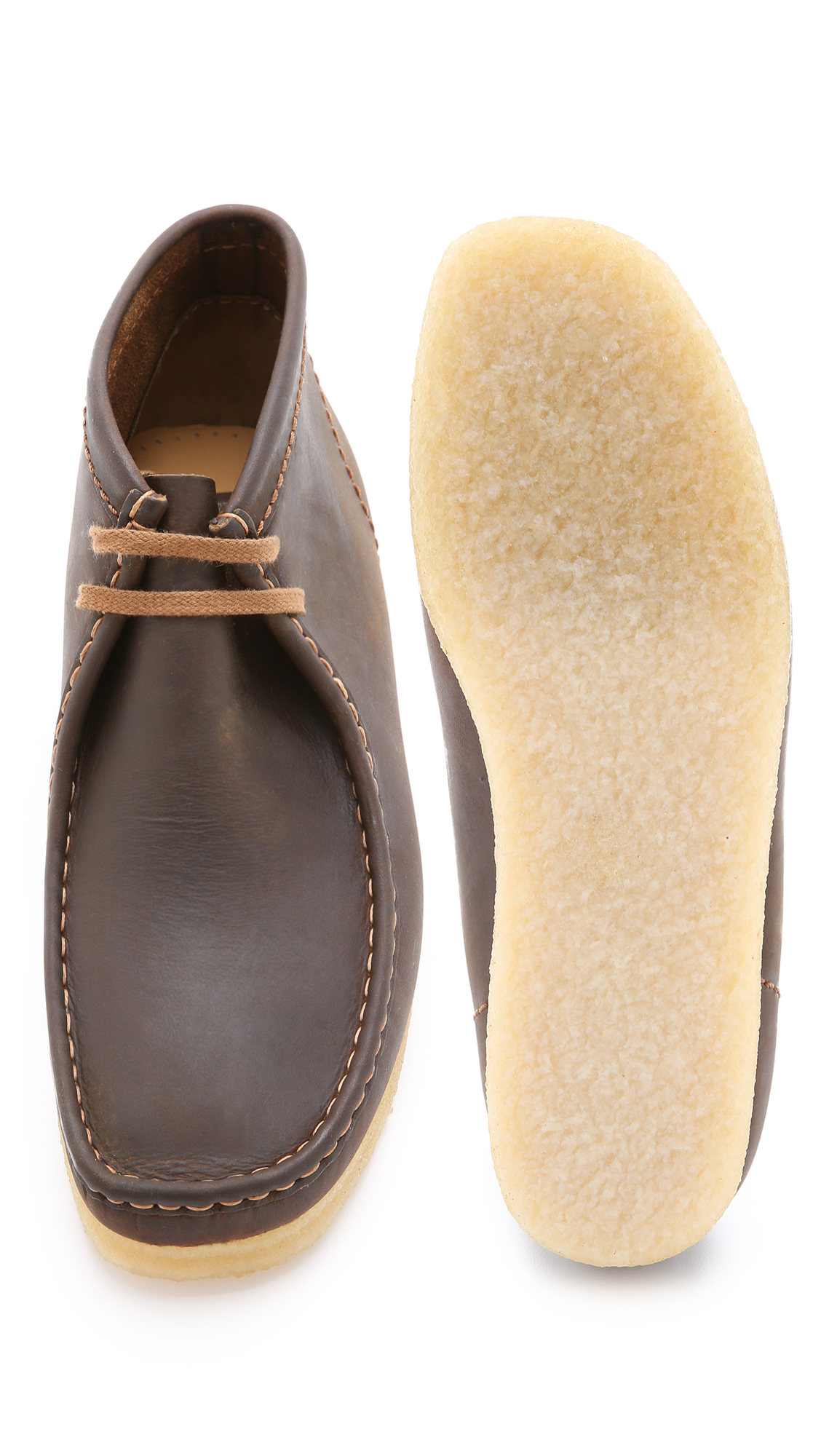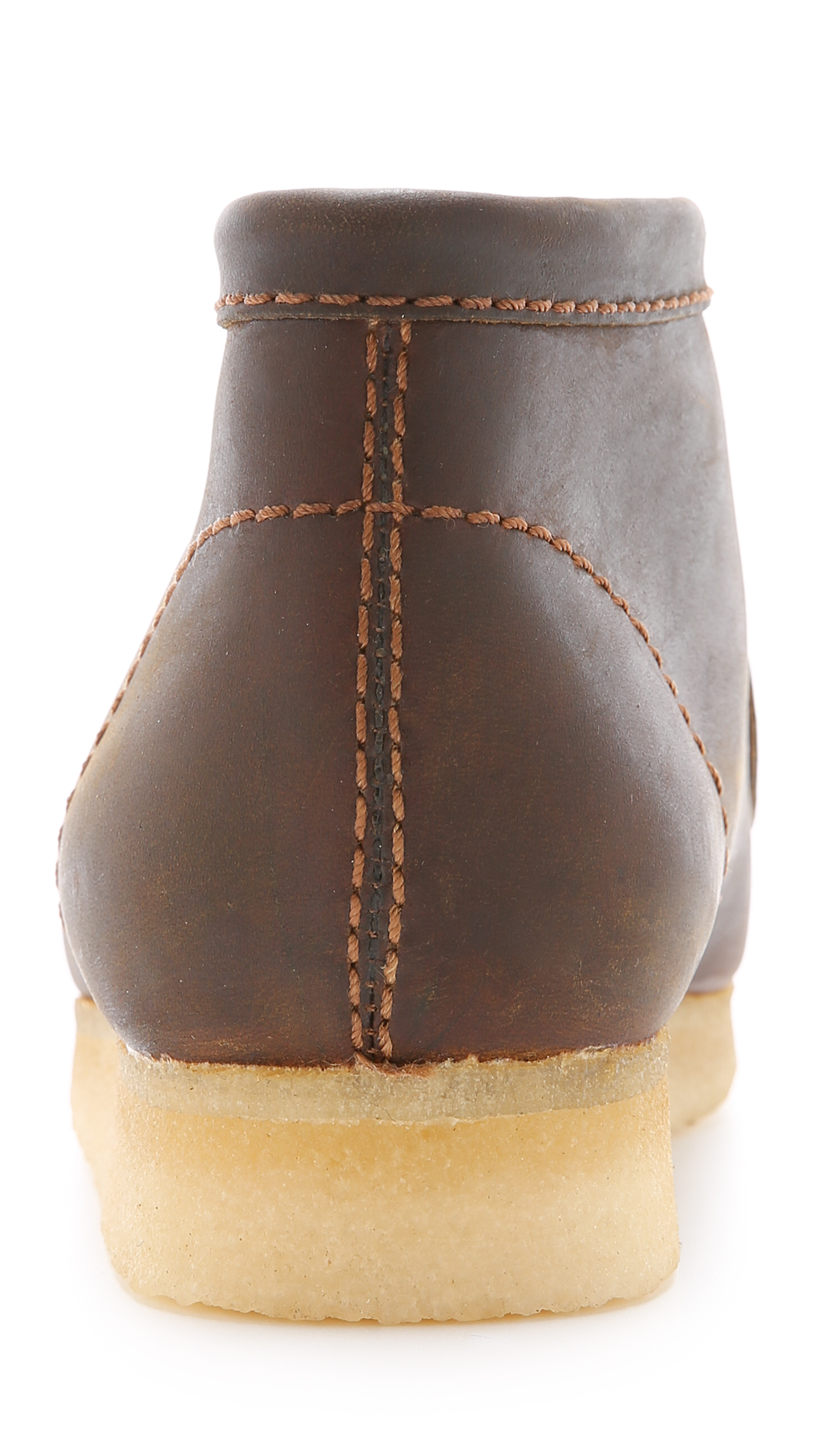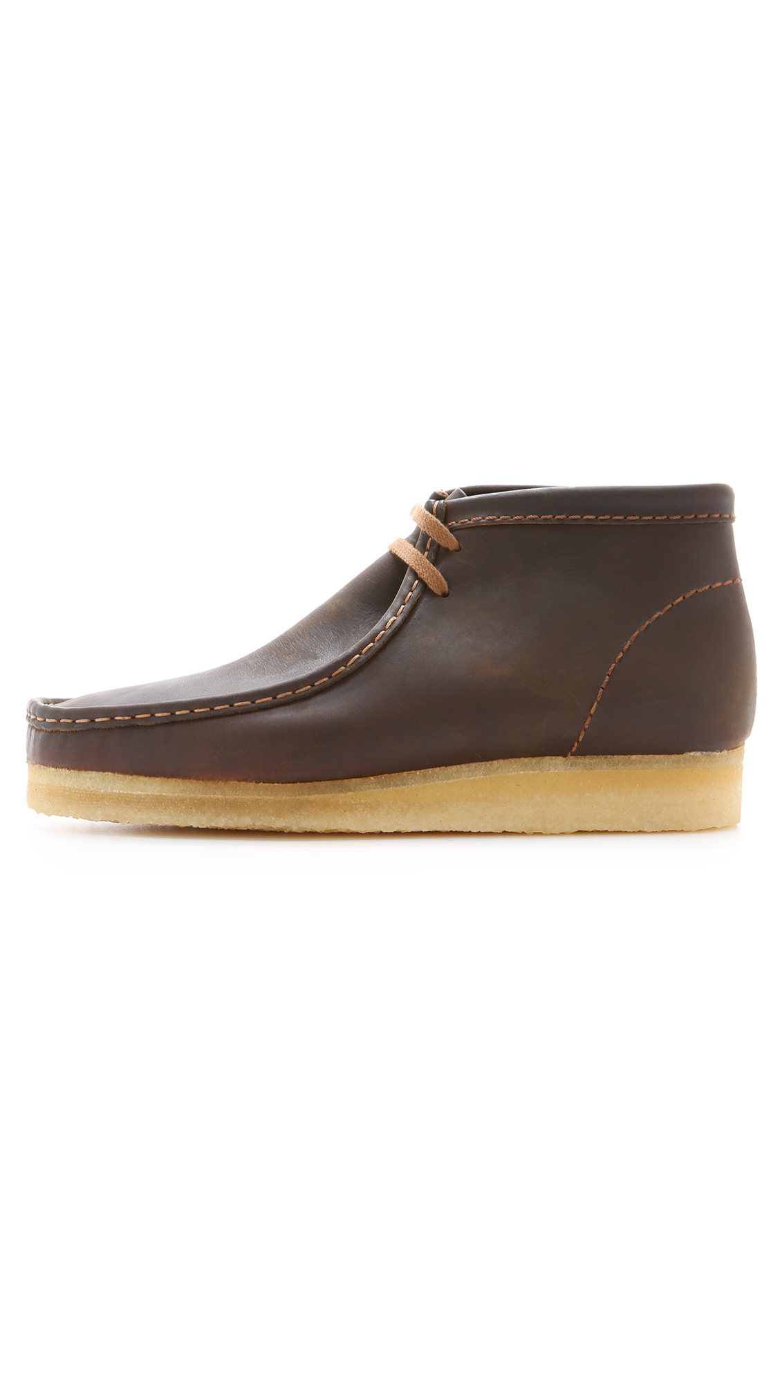 A re-release of the '60s moccassin-inspired Wallabee line, these rich leather Clarks boots have welted edges and a simple lace-up front. Gum sole. Cushion leather insole.