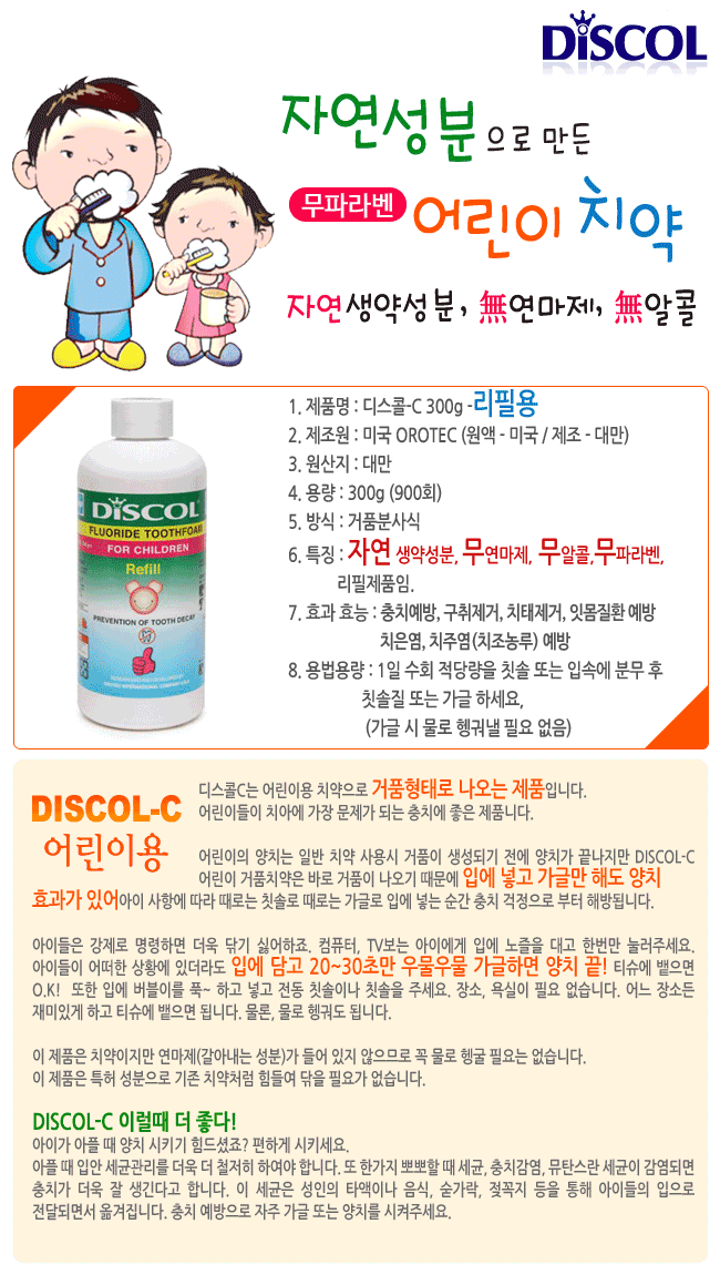 * 무연마제인 디스콜 거품치약으로 아이의 치아 에나멜을 보호해주세요