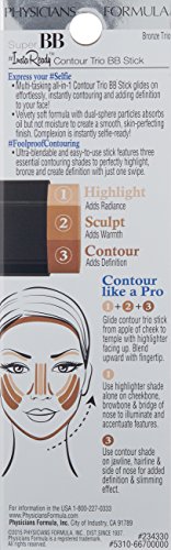 ReleaseDate : 2016-01-01 Studio : Physicians Formula Inc Publisher : Physicians Formula Inc Binding : Health and Beauty Product Description Express Your Selfie: Multi-tasking all-in-1 Contour Trio BB Stick glides on effortlessly, instantly contouring and adding definition to your face. Velvety soft formula with dual-sphere particles absorbs oil but not moisture to create a smooth, skin-perfecting finish. Complexion is instantly selfie-ready. Foolproof Contouring: Ultra-blendable and easy-to-use stick features three essential contouring shades to perfectly highlight, bronze and create definition with just one swipe. - Highlight: Adds radiance - Sculpt: Adds warmth - Contour: Adds definition Featuring InstaFilter Technology, a proprietary blend of mattifying and pore balancing spherical beads, color filter pigments and high-tech polymers that work together to instantly optimize light reflection, blur imperfections and visibly retexturize skin, while protecting against UVA/UVB damage with SPF 30. 0