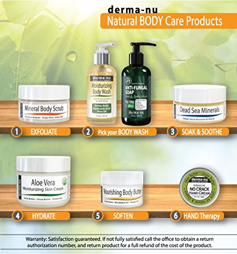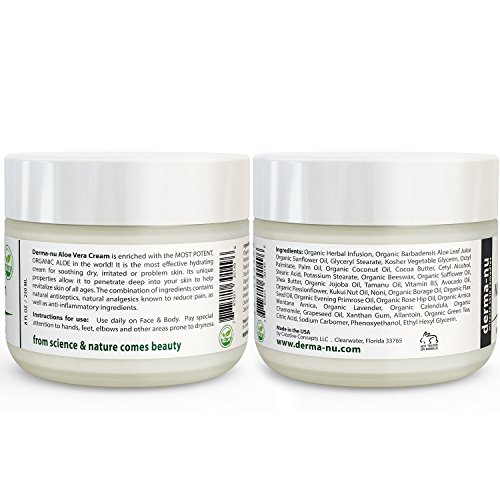 Derma-nu Aloe Vera Natural Dry Skin Cream is enriched with the MOST POTENT, ORGANIC ALOE VERA in the world! It is the most effective dry skin cream and a remedy skin repair cream for treatment for Psoriasis and as an Eczema Treatment. This Aloe Vera Cream's unique properties allow it to penetrate deep into your skin to help revitalize skin of all ages. The combination of ingredients contains natural antiseptics, natural analgesics known to reduce pain, as well as anti-inflammatory ingredients. Infused with the highest quality Organic Aloe Vera, Shea Butter, Cocoa Butter, Vitamin B5 and other tree and plant extracts, giving the added nutrients and healing benefits to the skin. It is the best dry skin cream for deep hydration, penetrating to the cellular level repairing and restoring the skins natural moisture balance. This clinically formulated Aloe Vera Cream helps to relieve many skin conditions, such as: • Dry SkinFeature