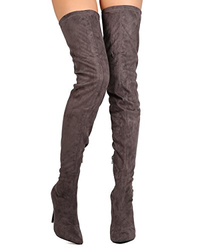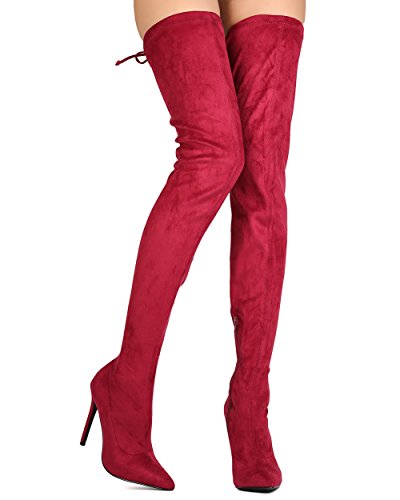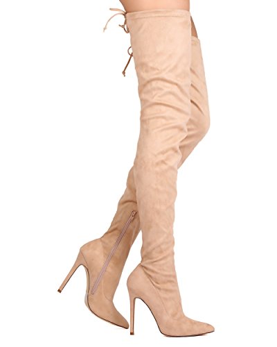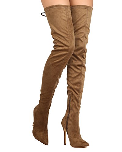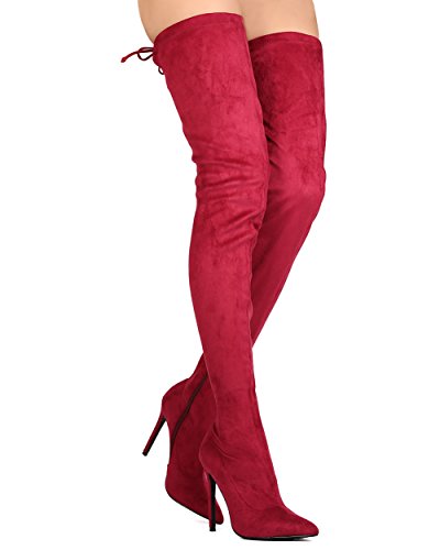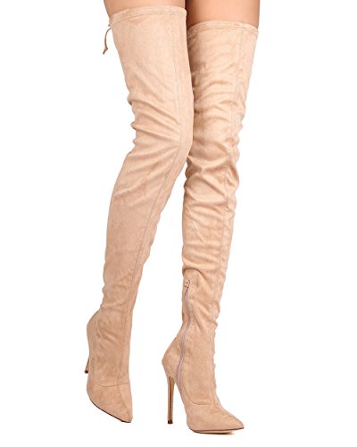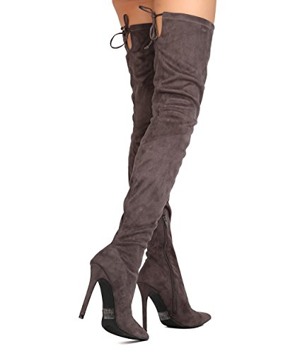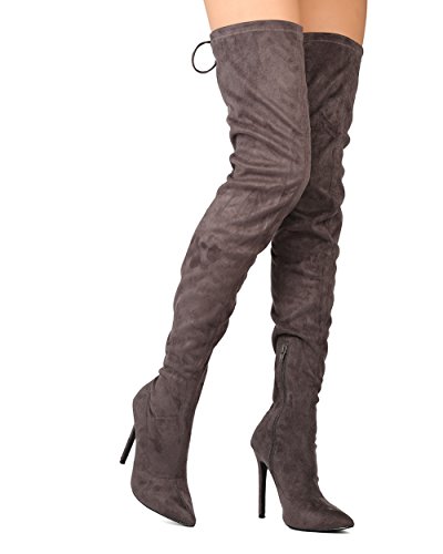 Product Description Designed with faux suede upper, extreme thigh high raise, pointy toe, stitch accents, single sole, covered stiletto heel, hind drawstring tie, and side zip for easy slip on and off. 0