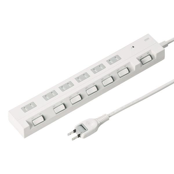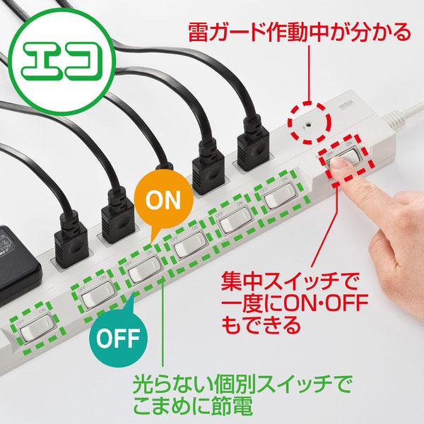 個別スイッチにより機器ごとのON・OFFが可能なので、待機電力がカットでき、節電効果があります。集中スイッチにより、6個口まとめてのON・OFFが可能で、待機電力がカットできます。ホコリ防止シャッターにより、ホコリの侵入を防ぎ、火事などの事故予防に効果的です。落雷による機器の故障を予防する雷ガードを搭載しています。狭い場所でもすっきり配線でき、壁に仮固定できるフック穴付きです。 | |