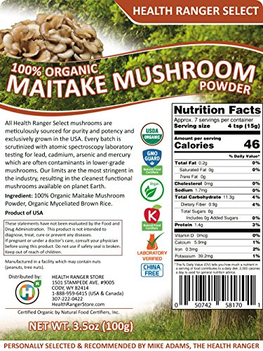 -. Binding : Misc. -. Brand : NN STORE -. EAN : 0029882516942 -. Feature : All Health Ranger Select mushrooms are meticulously sourced for purity and potency and exclusively grown in the USA. / Country of origin: grown and harvest in the USA. / Full Spectrum Reishi - 15% Beta Glucan (polysaccharide), no fillers / USDA certified organic, certified Kosher -. IsAdultProduct : 0 -. Label : Health Ranger Select -. Manufacturer : Health Ranger Select -. PackageQuantity : 1 -. ProductGroup : Grocery -. ProductTypeName : GROCERY -. Publisher : Health Ranger Select -. Studio : Health Ranger Select -. Title : Organic Reishi Mushroom Powder 100g -. UPC : 029882516942