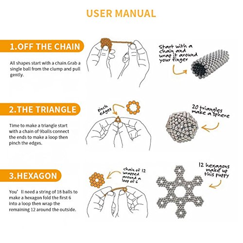 -. Feature : ♥⇢EXTREMELY PORTABLE:The size is 1.2*1.2*1.2inch,Made up of 216pcs small ball that diameter 0.2 inch,easy to carry.Perfect for daily use during your commute, downtime, break, or working hours,travel, It's perfect for anyone and a great gift for all! / ♥⇢ANTI-STRESS FUN: Express your creative side and have fun by crafting beautiful figures and impressive mini sculptures with our 5mm magnetic spheres. You might face some difficulties at the beginning but with patience and persistence your artistic skills will triumph. Be aware these magnets can be really "addictive". / ♥⇢EFFECTIVE & FUN ERGOTHERAPY: Try these magnets and relax with this helpful, stress relieving avocation. You can stimulate your creativity and enhance your hand and finger movement by using these magnet spheres wherever and whenever you want. Moreover, this is a good intelligence exercise designed for your fun! / ♥⇢INEXHAUSTIBLE FORMATIONS: There are literally limitless geometric or abstract patterns you can form with these 216 silver-colored magnets, countless shapes and designs to be used as modern home decoration, plus, you can even create Your Own Magnetic Jewelry (such as necklaces and bracelets), Star Shapes, Even a Teacup Mat and Many More. Great Decoration for an Office Desktop, Bedroom, Living Room etc.It All Comes Down to Your Creativity and Patience! / ♥⇢KINDLY NOTES: These magnetic balls contains small parts are not intended for children use, keep them away from children under 12 years to avoid any dangerous accidents. Avoid putting them in your nose or mouth and be sure to seek immediate medical attention if any of these magnets are swallowed or inhaled.