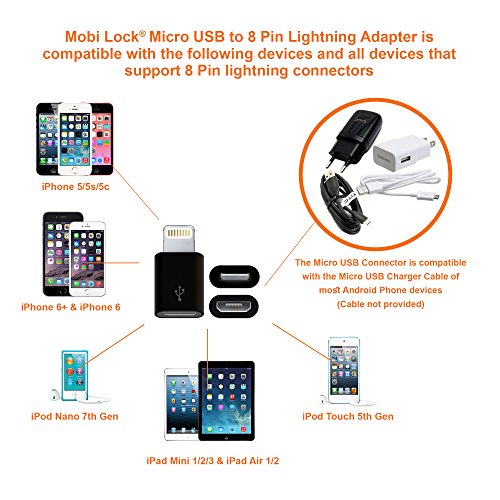 This Micro USB to Lightning Adapter connects your Micro USB adapters to your Apple devices such as iPod, iPhone or iPad to your computer's USB port for efficient syncing and charging. You can also use the USB Power Adapter for convenient charging from a wall outlet with a micro-USB cable (sold separately). So next time don't feel left out when you forget your iPhone data cable. Compatible Devices: Apple iPhone 6 / 6 Plus, Apple iPhone 5 / 5S / 5C, Apple iPad Mini 1 / 2 / 3, iPad Air 1 / 2, Apple iPad 4, Apple iPod Touch 5th Gen, Apple iPod Nano 7th Gen. Why Buy from Us: We created Mobi Lock® products with a single goal in mind: to make the smart life easier. That means starting with affordable, high-quality gear and ending with a commitment to 100% user satisfaction and a lifetime warranty. After all, we're customers too. Note: The only licensed seller of Mobi Lock® products is Lock Sourcing Ltd, do not buy from other sellers on this listing or you will receive sub standard products. If you buy from other sellers you will not be entitled to the Mobi Lock® lifetime warranty. Package content: 1 Black Micro USB to Lightning Adapter