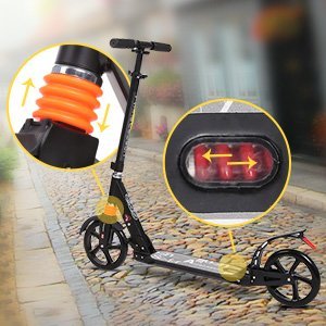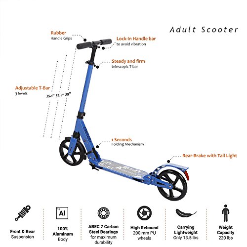 -. Feature : Adjustable T-bar:Adjustable handlebar with soft rubber comfortable hand grips and 3 level height adjustable, range 32.3-41.7 inch, Suit for adult, teens and kids age 8 up, Support weight 220lbs. / 1-Seconds Easy-Folding Mechanism:1-Seconds Easy-Folding Mechanism, suit for city urban scooter's quick storage and transportation, Portable with lightweight 13.5lb, No restrictions to carry on the tube, train or bus. / Anti-Rust Paint Foot Rear Brakes: ABEC 7 Carbon Bearings gives extra speed and a smooth ride. Dual Suspension System and an easy to access Anti-Rust Paint Foot Rear Brakes with which when pressed brings the scooter to a speedy secure stop. Large aluminum reinforced brake pedal is easy to use for quick and firm breaking fast. / Stable and Security: Front & rear shock, precision technology of rear brake / suspension, high density durable aluminum alloy frame and precision technology for good stable and security. / 100% Guarantee: Upgraded proccess and quality, Shipping from US (US STOCK),100% refund without any hesitation if our product couldn't meet your request.