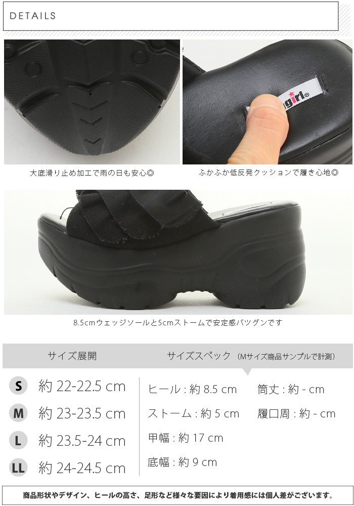 | サイズ | Sサイズ(22.0~22.5cm) Mサイズ(23.0~23.5cm) Lサイズ(23.5~24.0cm) LLサイズ(24.0~24.5cm) | | 実寸 | ヒール:約8.5cm ストーム:約5cm