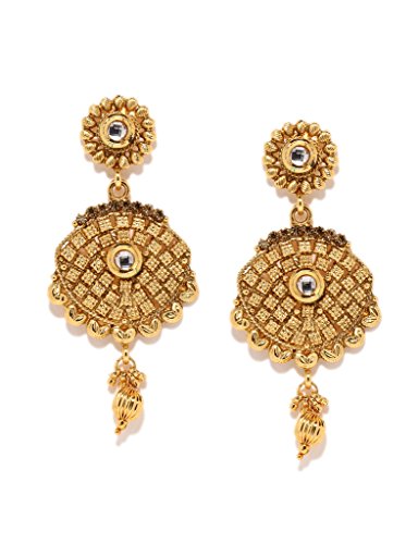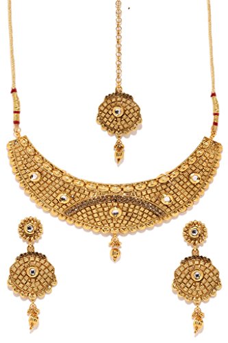 This jewellery set consists of a necklace, Mang tikka and a pair of earrings with secured with post-and-back closure. Gold-plated necklace encrusted with kundan like stones, has an intricately designed crescent-shaped centrepiece , secured with an adjustable drawstring fastening.