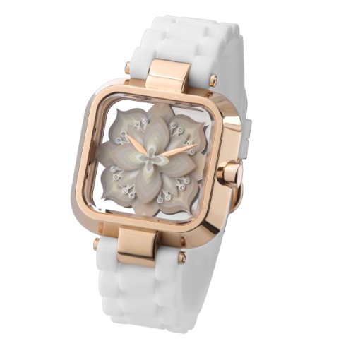 -. Feature : Top Brand, premium quality, Japanese designer watch, fantastic creative art style / The Untitled series by Sasu features a distinctive design of 3-dimensional off-white floral layering dial embellished with clear Swarovsk crystals. / See through case like crystal clear. Rose gold plated stainless steel case / Rose gold hands with second in rotating flower bud / White silicon band with rose gold stainless steel buckle