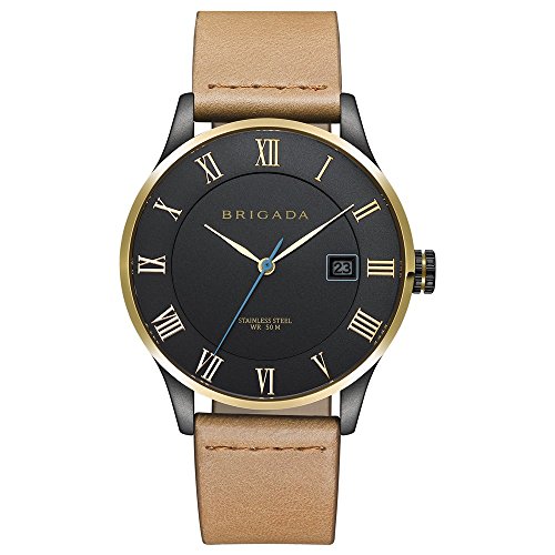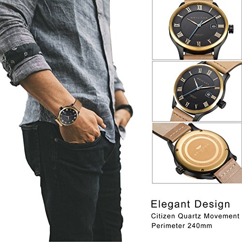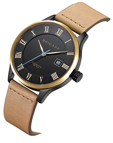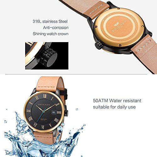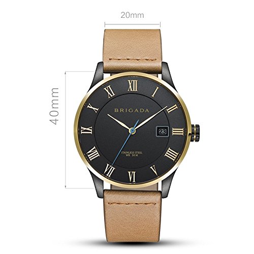 -. Feature : CLASSIC and FASHION BUSINESS CASUAL WATCH:mysterious frosted black,royal gold,Rome style number embossment and an exquisite but definitely thrilling sky blue second hand create a ravishing art in a minimalism charming way. / Outstanding Quality:stern Japan movement keeps time precise,fancy Italy breath leather bands and 1/4 length nylon fashion design,316L grade stainless steel gold case,Strong mineral screen glass,scientific approP.R.Iate and handsome size for men(band and whole watch).We send each watch to the QUALITY CONTROL center to make sure that every one of them is perfect before sending to FBA.2 year unlimited warranty for any problem if exist. / CONCISE BUT CAREFUL WORKMANSHIP ART:Rome style number embossment on a mysterious frosted black dial,golden-section hour hand and minute hand with a thrilling sky blue second hand,no need manual winding quartz movement,exquisite adjuster,date at 3,every detail is considered. / 5ATM WATER RESISTANT suitable for daily use and also anti-corrosion.40 mm diamete,10mm thickness. / BRIGADA men's watch,men's concise but solemn feelings.