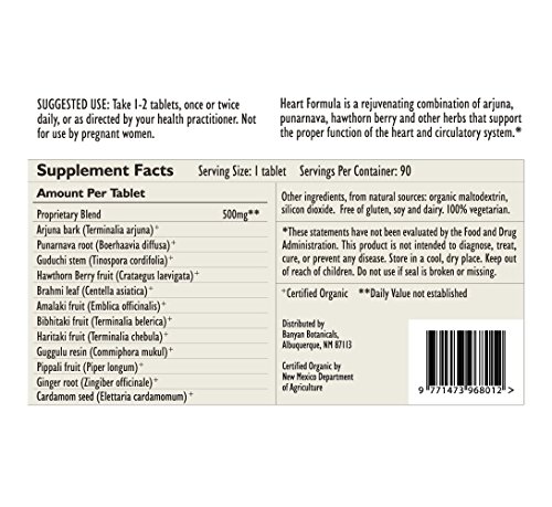 -. Binding : Health and Beauty -. Brand : Banyan Botanicals -. EAN : 0618192011614 -. Feature : Supports healthy function of the heart and circulatory system* / Supports healthy cholesterol levels that are already in the normal range* / Enhances sense of well-being* -. IsAdultProduct : 0 -. Label : Banyan Botanicals -. LegalDisclaimer : These statements have not been evaluated by the Food and Drug Administration. This product is not intended to diagnose, treat, cure, or prevent any disease -. Manufacturer : Banyan Botanicals -. MPN : 1161 -. PackageQuantity : 1 -. PartNumber : 1161 -. ProductGroup : Health and Beauty -. ProductTypeName : HEALTH_PERSONAL_CARE -. Publisher : Banyan Botanicals -. Size : 90 tabs -. Studio : Banyan Botanicals -. Title : Banyan Botanicals Heart Formula - Certified Organic, 90 Tablets - Supports Proper Function of the Heart -. UPC : 618192011614