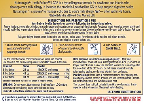 Nutramigen with Enflora LGG* is clinically proven to manage colic due to cow’s milk allergy fast, often within 48 hours†. The powdered form includes the probiotic LGG and has been proven to help build oral tolerance to cow’s milk. Nutramigen with Enflora LGG provides complete nutrition for your baby’s first year and is proven in over 70 studies. Its extensively broken-down proteins are hypoallergenic and easy to digest.