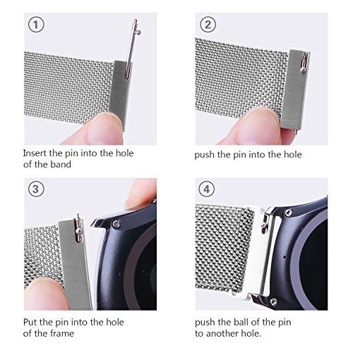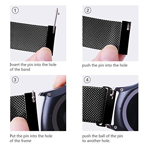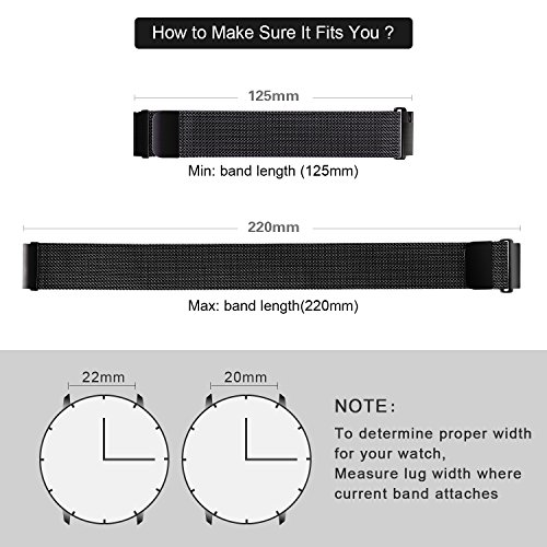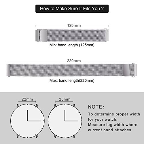 -. Feature : Band width -- 22mm/20mm; Thickness: 1mm. For most traditional or smart watch with 22mm/20mm lug. Not only fit for the brands watch belowed, also compatible with other watches with 20mm wide lug. For Samsung Gear S2/S3, Timex, Casio, Asus Zenwatch ,Seiko, Huawei, Tissot, Citizen, U.S. Polo, Stuhrling, Pebble, Nautica watches etc. / Premium Quality -- Flexible stainless steel mesh made of premium-quality 316 stainless steel ensuring its toughness and durability in use. Adjustable and strong magnetic Milanese Loop without buckle allows for perfect and fit adjustment. And just easily stick and lock your watch band.. / Adjustable Length -- The watch band's length is adjustable from 5.5'' to 9.5''(143mm - 241mm). Flexible stainless steel mesh with infinitely adjustable magnetic closure clasp allows for individualized adjustment to achieve the perfect fit. Unique magnet clasp design, no buckle needed. / Quick-release Installation -- Slide quick release pins with finger to release or attach strap. Easy to get it. No tools needed. / 12-MONTH WARRANTY -- If anything is wrong - please feel free to contact us - we will make it right. Package : Including 1* watchband + 4* qucik release pins.
