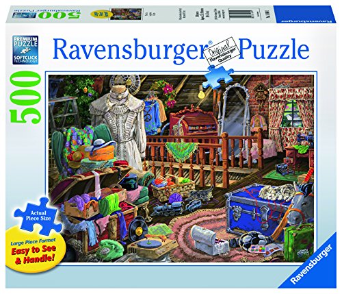 -. Binding : Toy -. Brand : Ravensburger -. EAN : 4005556148691 -. Feature : Puzzle Measures: 27" x 20" / Large Piece Format - Easy to see & handle / Puzzles are fun! on your own, or with family and friends / Relax from your busy life, build a beautiful image and a new memory / Take a moment to slow down and experience the pleasure of a puzzle -. Genre : strategy -. IsAdultProduct : 0 -. ItemPartNumber : RAV14869 -. Label : Ravensburger -. Manufacturer : Ravensburger -. Model : 14869 -. MPN : 14869 -. NumberOfItems : 1 -. PackageQuantity : 1 -. PartNumber : 14869 -. ProductGroup : Toy -. ProductTypeName : TOYS_AND_GAMES -. Publisher : Ravensburger -. Studio : Ravensburger -. Title : Ravensburger The Attic Large Format Jigsaw Puzzle (500 Piece) -. Warranty : Lifetime warranty against manufacturer's defects