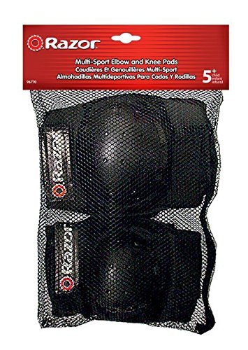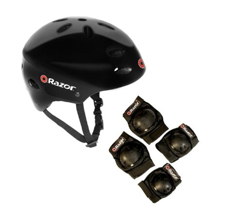 -. Brand : Razor -. Color : Black -. EAN : 9786163001313 -. Feature : Make sure to keep your little ones safe during playtime / Great for biking, skating, scooter riding and more / Ergonomic interior padding is comfortable and secure / 17 top and side vents allows airflow and helps riders keep a cool head on hot days / Side release buckles adjust and fasten quickly -. ISBN : 6163001311 -. Label : RAZOR -. Manufacturer : RAZOR -. MPN : 97780 + 96770 -. PackageQuantity : 1 -. PartNumber : 97780 + 96770 -. ProductGroup : Sports -. ProductTypeName : OUTDOOR_RECREATION_PRODUCT -. Publisher : RAZOR -. Studio : RAZOR -. Title : Razor V17 Child Skateboard/Scooter Sport Helmet with Knee & Elbow Pads Set -. UPC : 977809677088