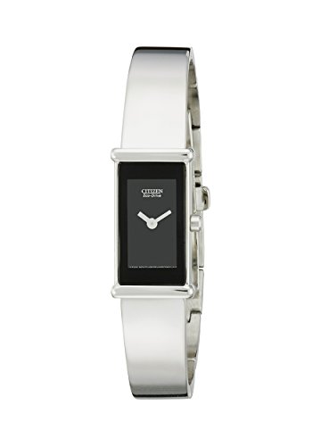 Studio : Citizen Publisher : Citizen Binding : Watch Amazon.com Dress to impress with this silver-tone Citizen Silhouette Bangle Eco-Drive stainless steel women's watch, which offers a sleek design that matches nicely with your stylish contemporary couture. This thin profile watch will sit demurely and lightly on your wrist, and it offers a smooth, minimalist stainless steel bangle-style bracelet. The tall rectangular watch case features a thin bezel that frames an equally spare black dial with just two tiny baton hands in silver. Other features include a scratch-resistant sapphire crystal and water resistance to 30 meters (99 feet), which will protect the watch from rain and accidental splashes. This watch is powered by Citizen's unique Eco-Drive, which absorbs sunlight and any artificial light through the crystal and dial to recharge the watch continuously. With regular exposure to light, the Eco-Drive continuously recharges itself for a lifetime of use. This watch's Eco-Drive provides a 365-day power reserve. 0