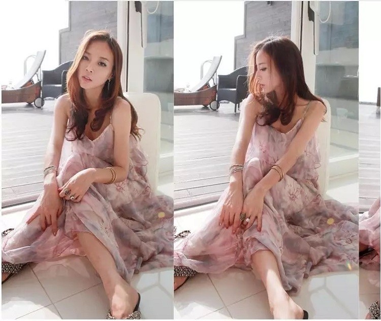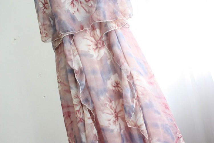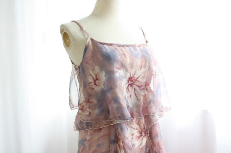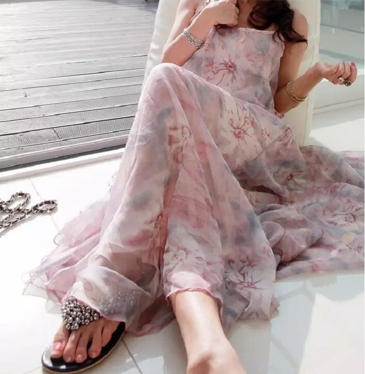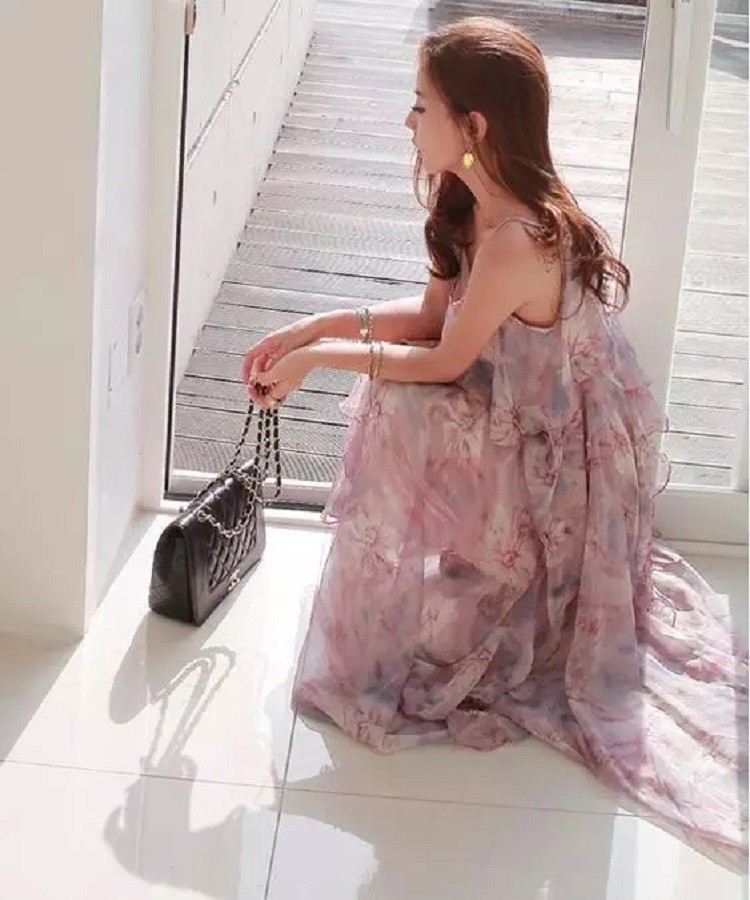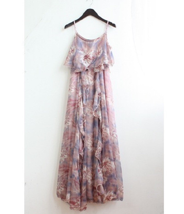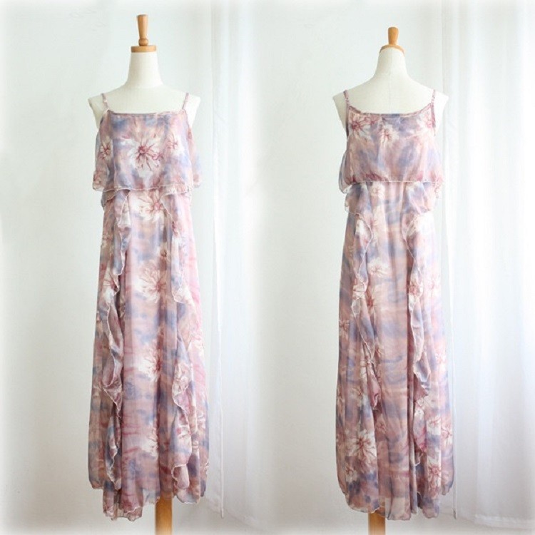 淡いグラデーションカラーのフラワープリントが上品フェミニンなマキシ丈のノースリーブワンピース。