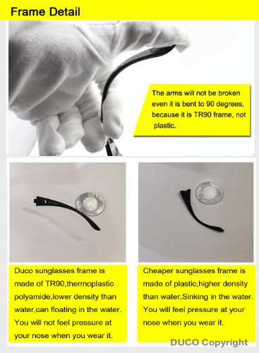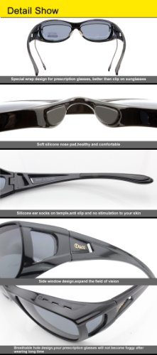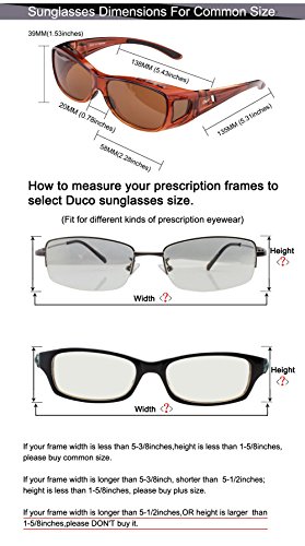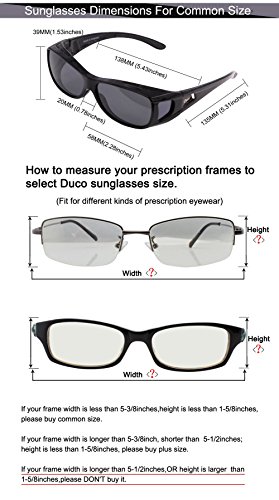 -. Feature : Finally! Polarized sunglasses can be worn over existing prescription glasses with Fashion appeal and designer features. Please take a minute to check detail page. / This DUCO sunglasses fits over Extra Small,Small to Medium and Large size Rx glasses.See measuring instructions below or left image with measuring instructions for proper fit. / The frame is made of TR90,it is extreme flexibility, durability and light weight make it the perfect material for performance eyewear.It can be bent to 90 degrees without broken and can float over water.(See image left) So it is much worth your money than other's Polycarbonate Frame which may be half of DUCO's P.R.Ice. / DUCO Polarized lenses are made using an injection process that ensures they??re optically correct, decreasing eye fatigue and increasing comfort. DUCO Shatterproof TAC POLARIZED lens have a filter that works to prevent the glare from reflecting on flat surfaces (water, snow, road pavement) which interfere with vision to protect your eye for the UV damage.So it is 100% UVA and UVB Protection. / 30 Day Money Back Guarantee.Lifetime Breakage Warranty. It must worth your money,return and refund is applicable for any reason.Just have a try.