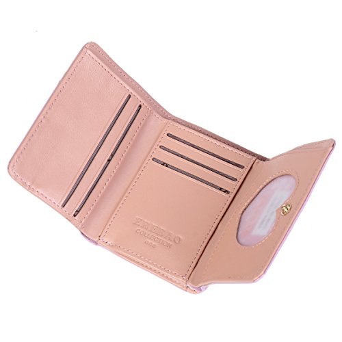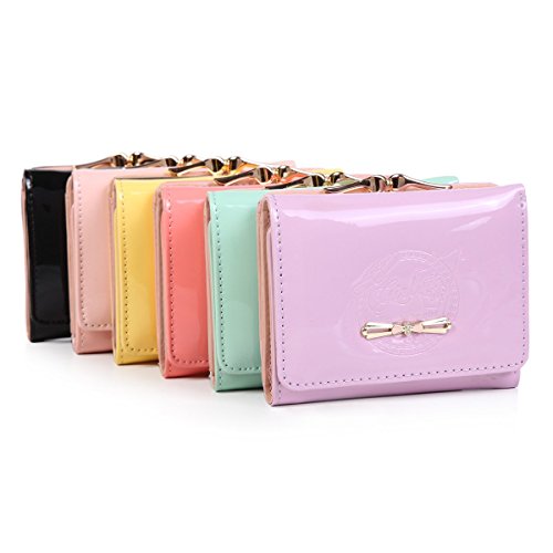 -. Feature : Patent leather material / Slim metal bowknot adorn on the front / Trifold structure with snap and kiss-lock closure / Interior 7 card slots ,1 clear hear-shape photo/ID window,1 main compartment for banknote and bills,a hasp closure pocket for cards / Dimensions: 4.2"*3.2"*1.2"(10.5*8.2*1.2cm)