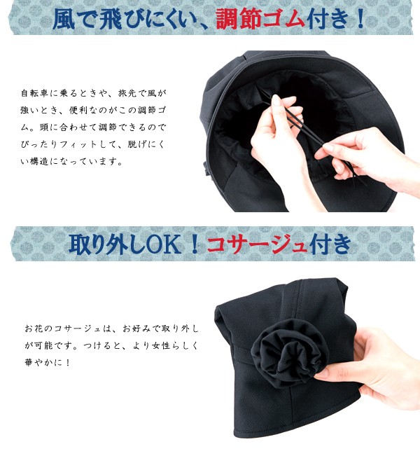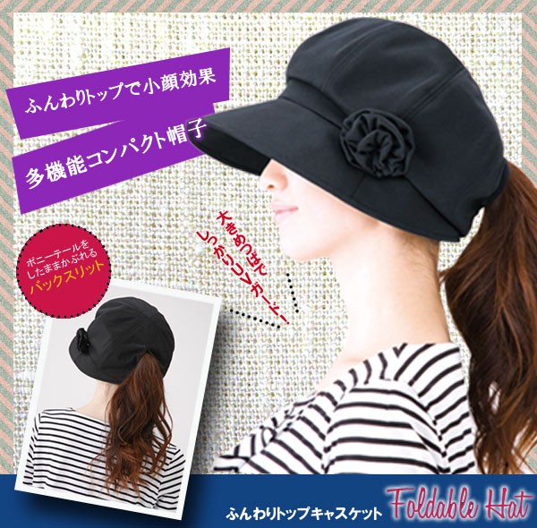 大きめつばでしっかりUVガード!トップがふんわりで髪型崩れにくい☆調節ゴム付きで強い風の日も飛びにくい!バックスリット入りでポニーテールをしたままかぶれるから、暑い夏も涼しく快適♪取り外しOKのお花型コサージュ付き★合わせやすいブラック。