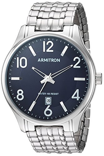 Mineral crystal lens; matte navy blue dial with date calendar window; silver-tone skeleton hands and markers; white printed outer minute track