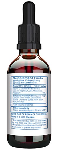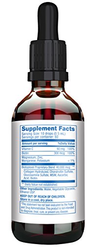 SEVEN OF THE MOST EFFECTIVE AND ESSENTIALLY SUBSTANCES (Glucosamine, Chondroitin, MSM, Hyaluronic Acid, Collagen Hydrolyzed, Biotin, Vitamin C) in an easily absorbed liquid form for supporting the good health of joints, bones and muscles; increases skin firmness and hydration. The formulation have anti-aging properties, improves skin elasticity and skin moisture. This product combination also supports the strength and growth of hair and nails. Thickens fine hair.