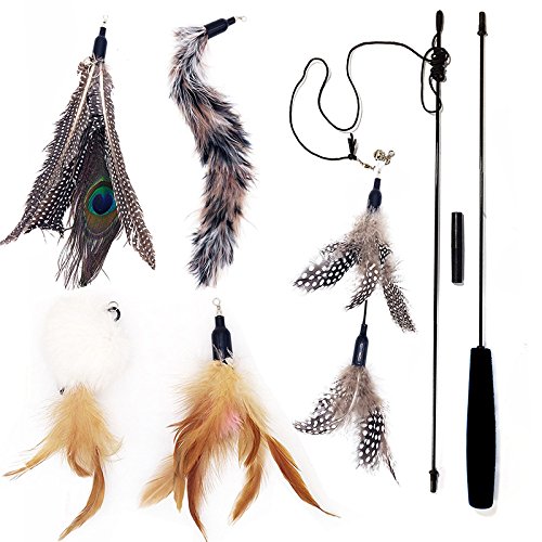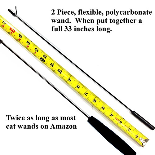 ❤ 33" LONG NYLON STRING, 33" STRONG POLYCARBONATE WAND - 5 x Feather Refills with bell, 1 x 33"/85cm Wand(detachable ) with 33"/85cm nylon string. Super strong and elastic wand available suffer 90 degree bend. Read a book or watch T.V. while you entertain and exercising your little fur ball. Great for cats, young and old. Keeps them fit and active. Your cat won't be able to resist chasing this wand around the house.