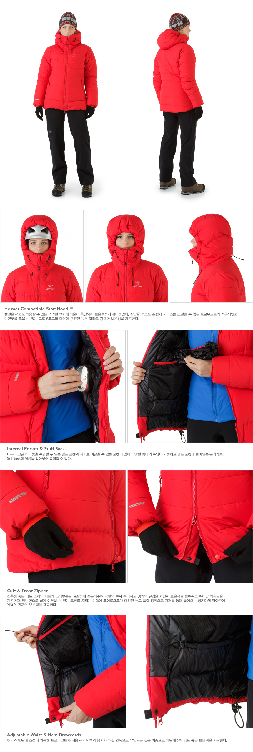 아크테릭스 최초의 헤비 구스 다운 재킷. WINDSTOPPER® 소재, 850 필파워의 그레이 구스 다운, 냉점(冷点, cold spot)을 없애주는 박스월(Box wall) 공법이 사용돼 아크테릭스 에센셀 컬렉션 중 가장 탁월한 보온력을 자랑한다.
