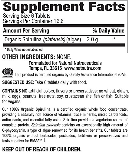 This 100% organic spirulina supplement from Natural Nutra is gluten-free, vegan, and vegetarian. There are no artificial colorings, flavorings, preservatives, milk, eggs, peanuts, tree nuts, soy, shellfish, or fish.