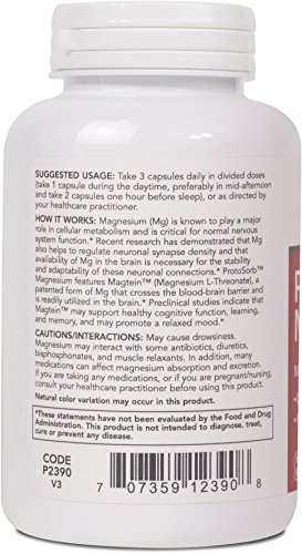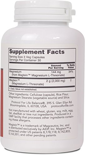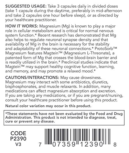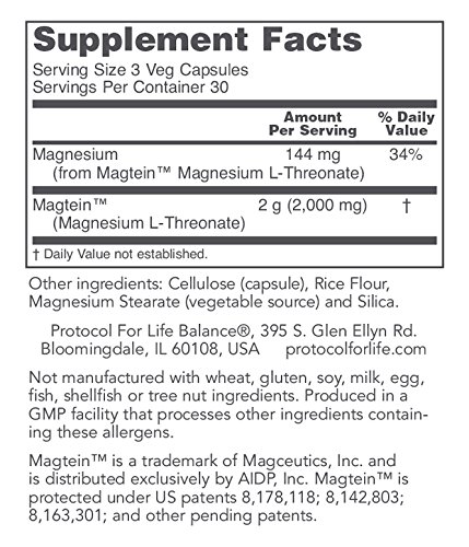 HOW IT WORKS: Magnesium (Mg) is known to play a major role in cellular metabolism and is critical for normal nervous system function.* Recent research has demonstrated that Mg also helps to regulate neuronal synapse density and that availability of Mg in the brain is necessary for the stability and adaptability of these neuronal connections.* ProtoSorbTM Magnesium features MagteinTM (Magnesium L-Threonate), a patented form of Mg that crosses the blood-brain barrier and is readily utilized in the brain.* Preclinical studies indicate that MagteinTM may support healthy cognitive function, learning, and memory, and may promote a relaxed mood.*Protocol For Life Balance® is an A-rated GMP manufacturer of pharmaceutical grade dietary supplements created for healthcare practitioners. Our product line is comprised of effective, science-based formulations intended to address common nutrient deficiencies and support healthy physiological function. These formulations are based on the latest advances in nutritional science and incorporate trademarked ingredients of the highest quality. Our serving sizes are based on doses used in clinical trials and other published data, and the ingredients used in our products have been tested for efficacy in clinical trials and laboratory studies.
