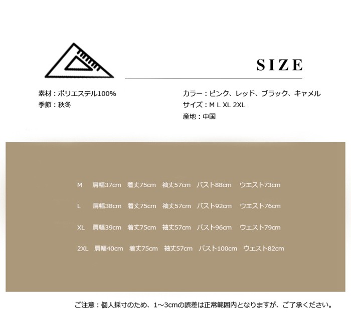 チェスターコート レディース 大きいサイズ ロング丈 秋冬アウター 無地 ラシャコート レディース ジャケット 通勤 2018秋冬新作 ピーコート レディース 大きいサイズ ロング丈 アウター 無地商品詳細素材:ポリエステル100%季節:秋冬カラー:ピンク、レッド、ブラック、キャメルサイズ:M L XL 2XL産地:中国サイズ参照表M 肩幅37cm 着丈75cm 袖丈57cm バスト88cm ウエスト73cm L 肩幅38cm 着丈75cm 袖丈57cm バスト92cm ウエスト76cmXL 肩幅39cm 着丈75cm 袖丈57cm バスト96cm ウエスト79cm2XL 肩幅40cm 着丈75cm 袖丈57cm バスト100cm ウエスト82cmご注意:個人採寸のため、1~3cmの誤差は正常範囲内となりますが、ご了承ください。チェスターコート レディース 大きいサイズ ロング丈 秋冬アウター 無地 ラシャコート レディース ジャケット 通勤 2018秋冬新作 チェスターコート レディース 大きいサイズ ロング丈 アウター 無地