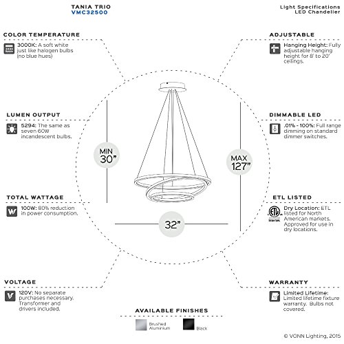 VONN VMC32500BL Modern 32" Led Chandelier, Adjustable Hanging Light, Modern Circular Chandelier Lighting, Tania Trio Collection, Black