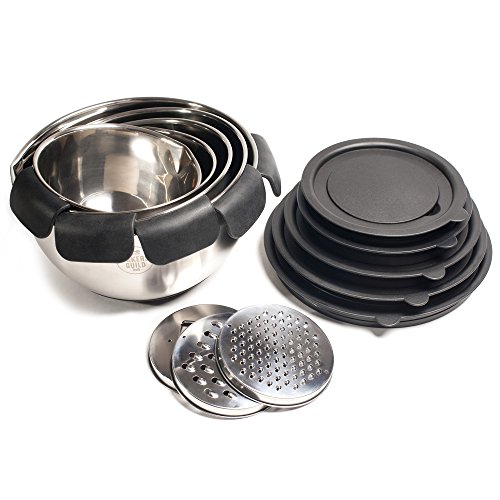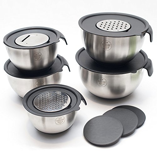 Set of 5 Stainless Steel Non-Slip Nesting Mixing Bowl Set with Lids and 3 Interchangeable Graters, Pouring spout and Ergonomic Handles and Volume Measurements (16 piece set) By Bakers Guild Tools