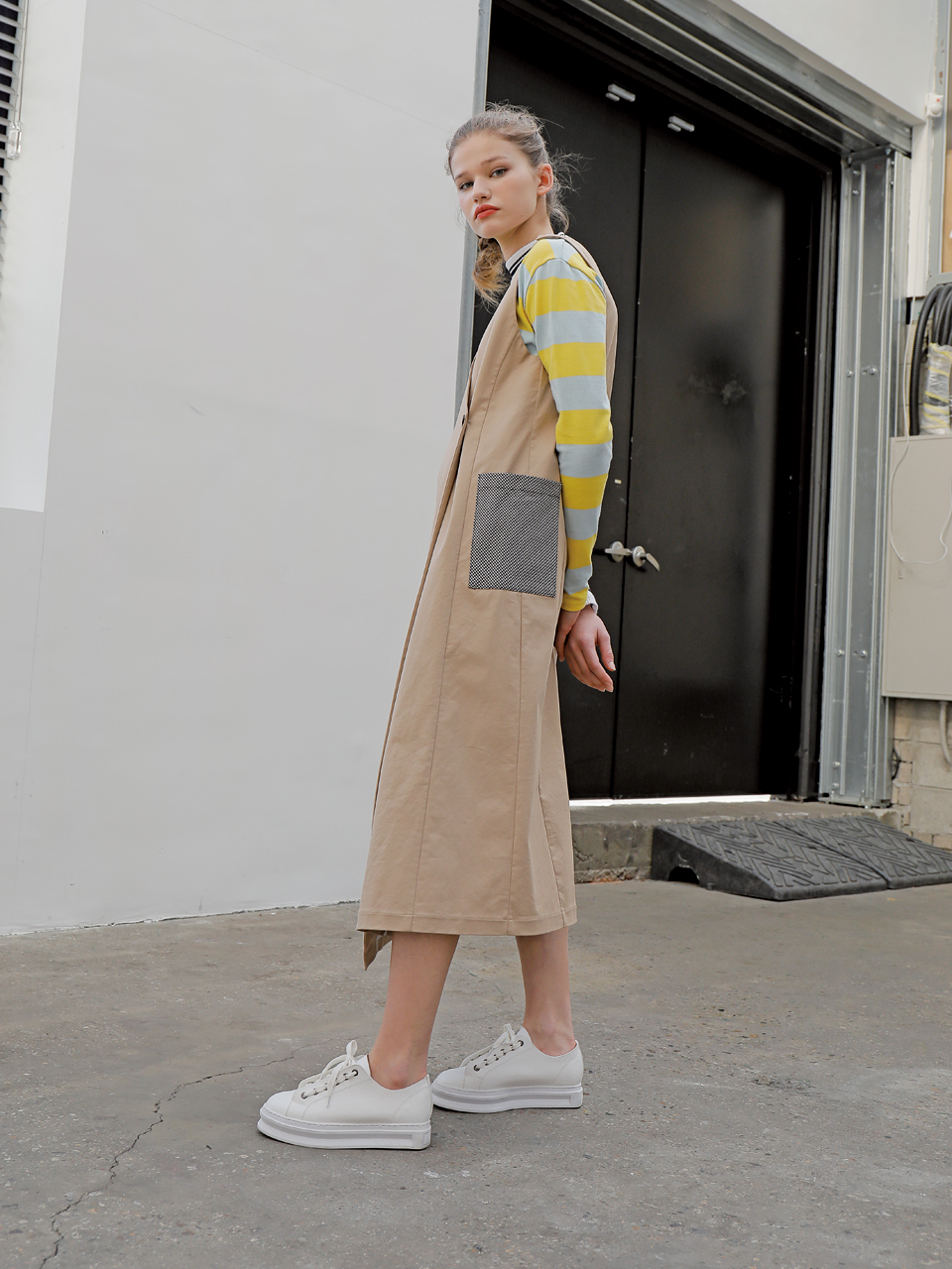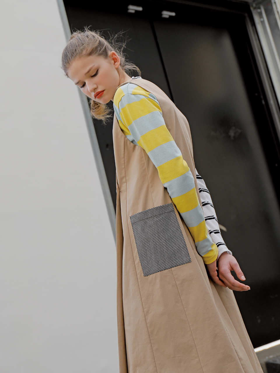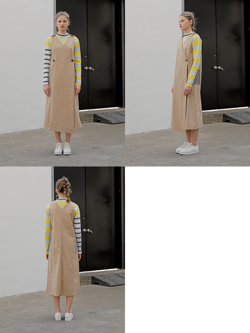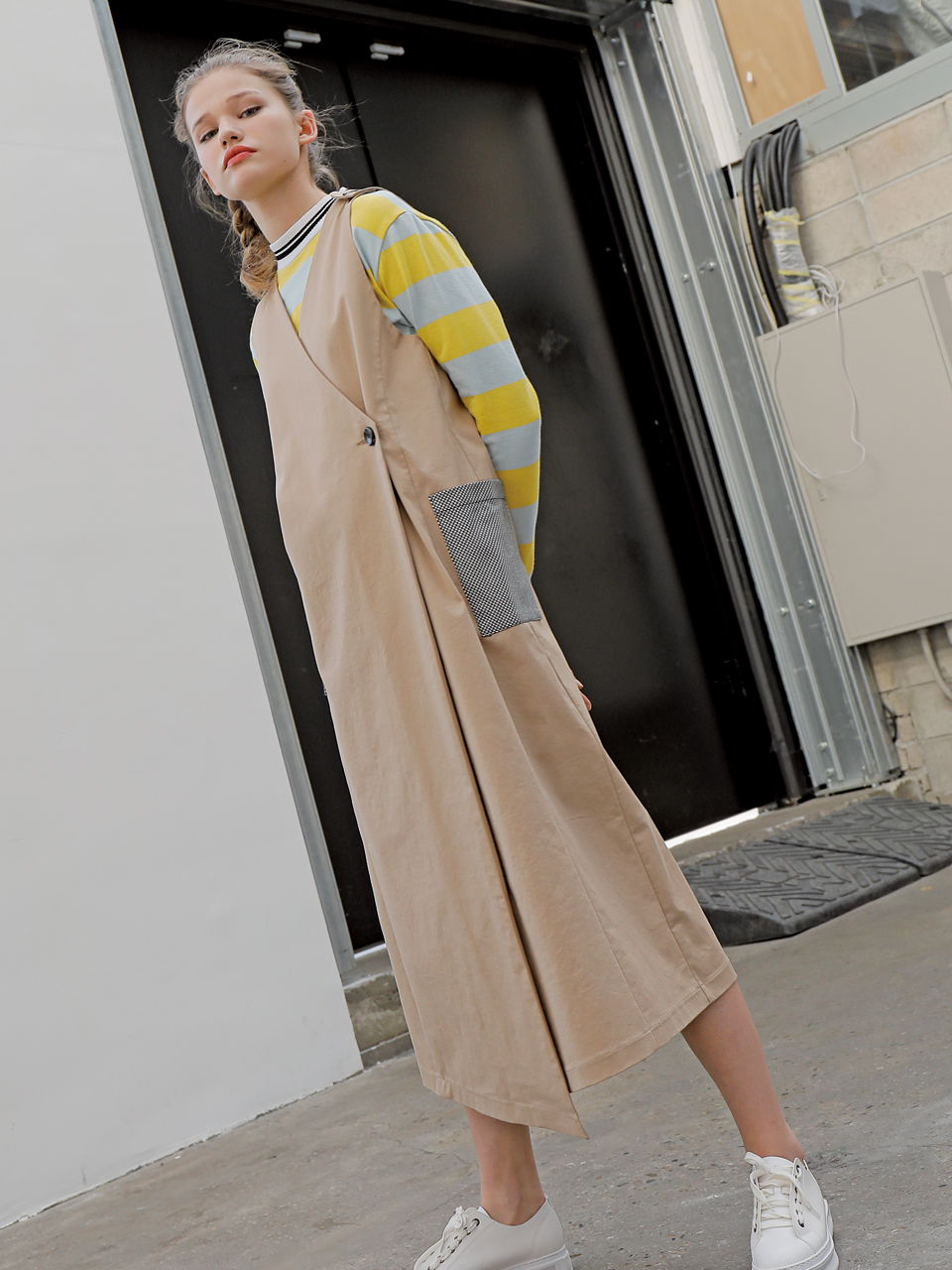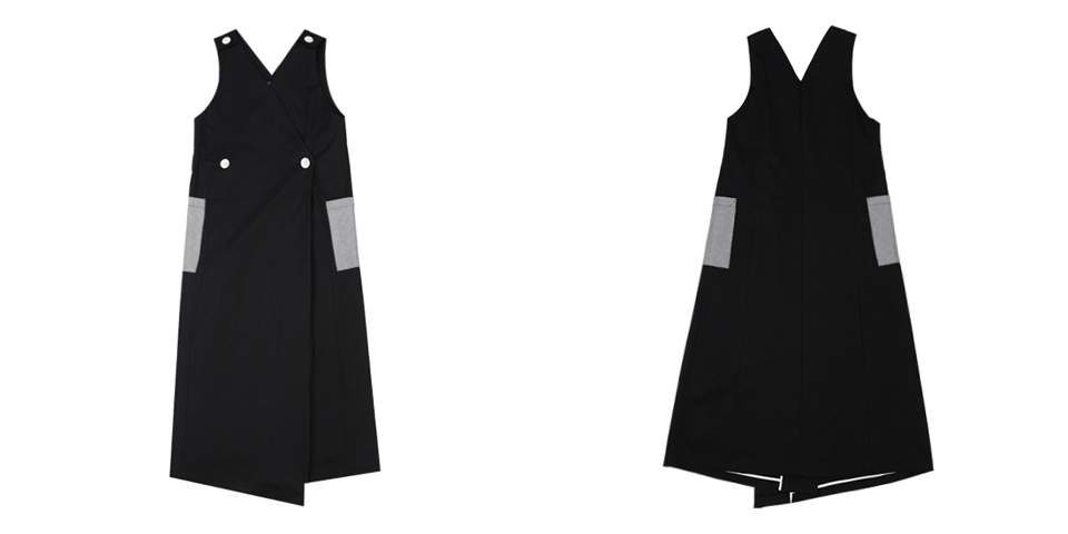 롱 베스트 형태의 コットン 스판 드레스입니다. 딥 브이넥 디자인으로 어깨와 전面에 단추로 여밈 디테일이 들어가있는 제품입니다. 사이드라인에 체크 패턴의 패치 포켓이 부착되어있습니다. 베이지, 블랙 두 가지 カラー으로 출시되었습니다.