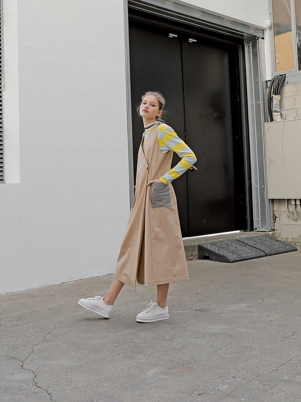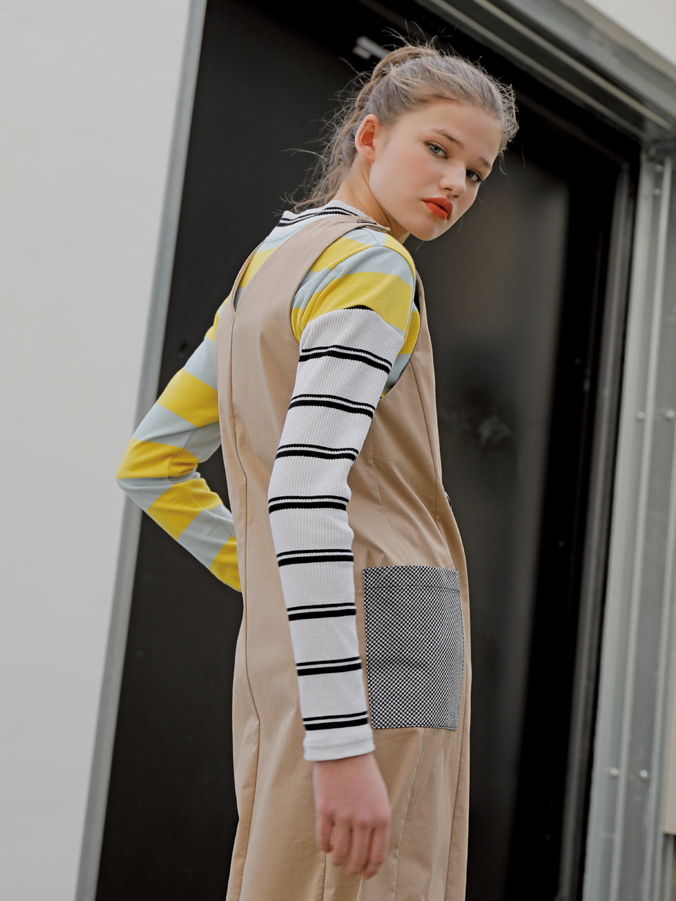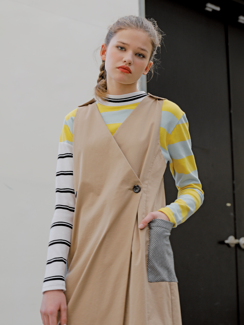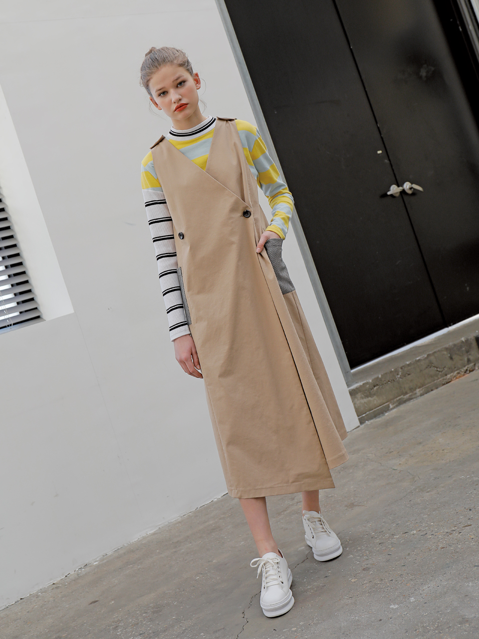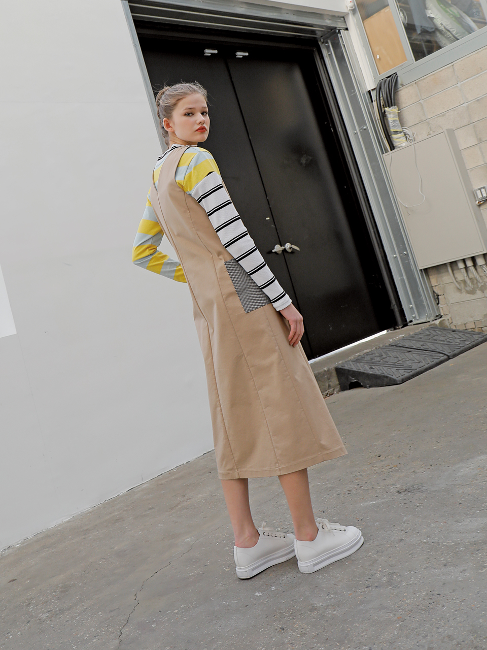 롱 베스트 형태의 コットン 스판 드레스입니다. 딥 브이넥 디자인으로 어깨와 전面에 단추로 여밈 디테일이 들어가있는 제품입니다. 사이드라인에 체크 패턴의 패치 포켓이 부착되어있습니다. 베이지, 블랙 두 가지 カラー으로 출시되었습니다.