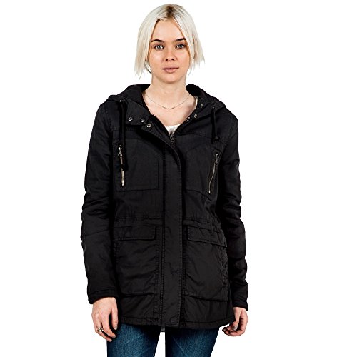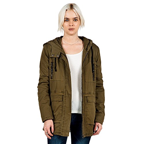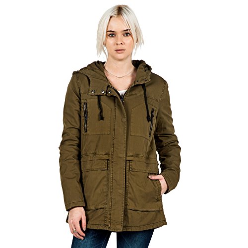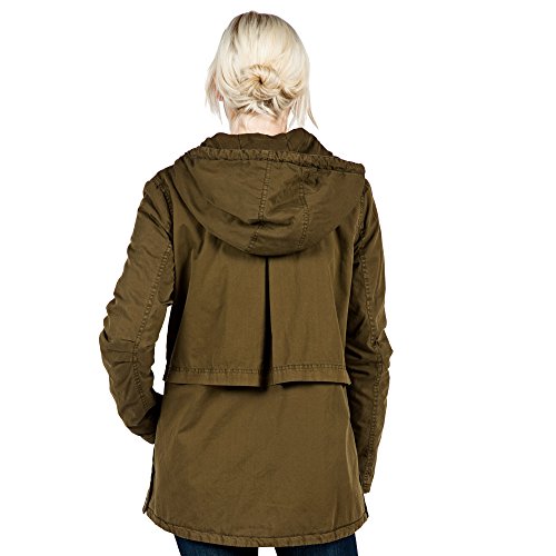 Hooded military-inspired jacket featuring four utility pockets at front and faux gun flap with inverted pleat in back